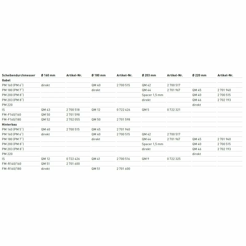 - QM 5 – 203 mm (QM43 – 203 mm an IS8″-Gabeln)
