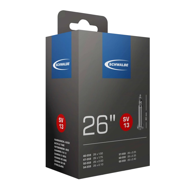 Neben den Reifen zählt ein Fahrradschlauch mit zu den wichtigsten Komponenten eines Laufrades, da er großen Einfluss auf die Rolleigenschaften deines Bikes haben kann und darüber hinaus über einen langen Zeitraum hinweg hohen Belastungen ausgesetzt ist. Eine weitere Anforderung an gute Schläuche ist die Fähigkeit, möglichst lange die Luft halten zu können, ohne das ein Nachpumpen erforderlich ist. Diesen Anforderungen werden Schwalbe-Schläuche seit Jahren auf perfekte Art und Weise gerecht, weshalb sie bei vielen Bikern zur ersten Wahl gehören. Der mit einem Slaverandventil (Französisches Ventil) ausgestattete SV 13 reiht sich nahtlos ein in die lange Liste der aufgrund ihrer vielen positiven Eigenschaften äußerst beliebten Schwalbe-Schläuche. Dieser zwar nicht besonders leichte, dafür aber langlebige und pannensichere Schlauch empfiehlt sich insbesondere MTBs mit 26 Zoll Laufrädern und einer Reifenbreite von 1,5“ bis 2,5“.