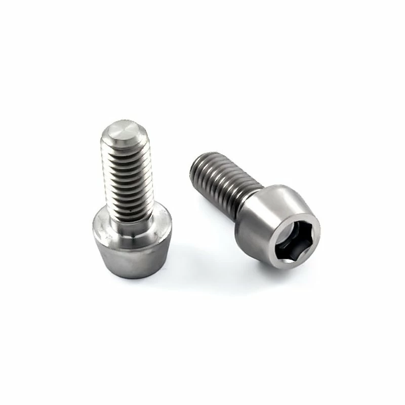 Titan überzeugt mit guten Korrosionsbeständigkeit bei einer gleichzeitig hohen Zugfestigkeit und eignet sich daher perfekt zur Herstellung von exklusiven Leichtbauteilen, ohne Einbußen bei der Haltbarkeit und Zuverlässigkeit eingehen zu müssen. Aus Titan gefertigte Bauteile und Schrauben eignen sich daher durchaus auch für die Verwendung in Bereichen mit Sicherheitsrelevanz und können hier ohne Bedenken anstatt der originalen Teile und Schrauben eingesetzt werden. Bei einer Zugfestigkeit, die über der von gewöhnlichen 8.8er Stahlschrauben entspricht, liegt das Gewicht nur bei 60%, wodurch sich mitunter eine erhebliche Gewichtersparnis realisieren lässt. Die in unterschiedlichen Gewindedurchmessern, sowie vielen verschiedenen Längen erhältlichen Schrauben mit konischem Kopf (ähnlich DIN 912) verfügen zur Übertragung des Anzugsdrehmoments über einen Mitnahmeprofil mit Innensechskant.
